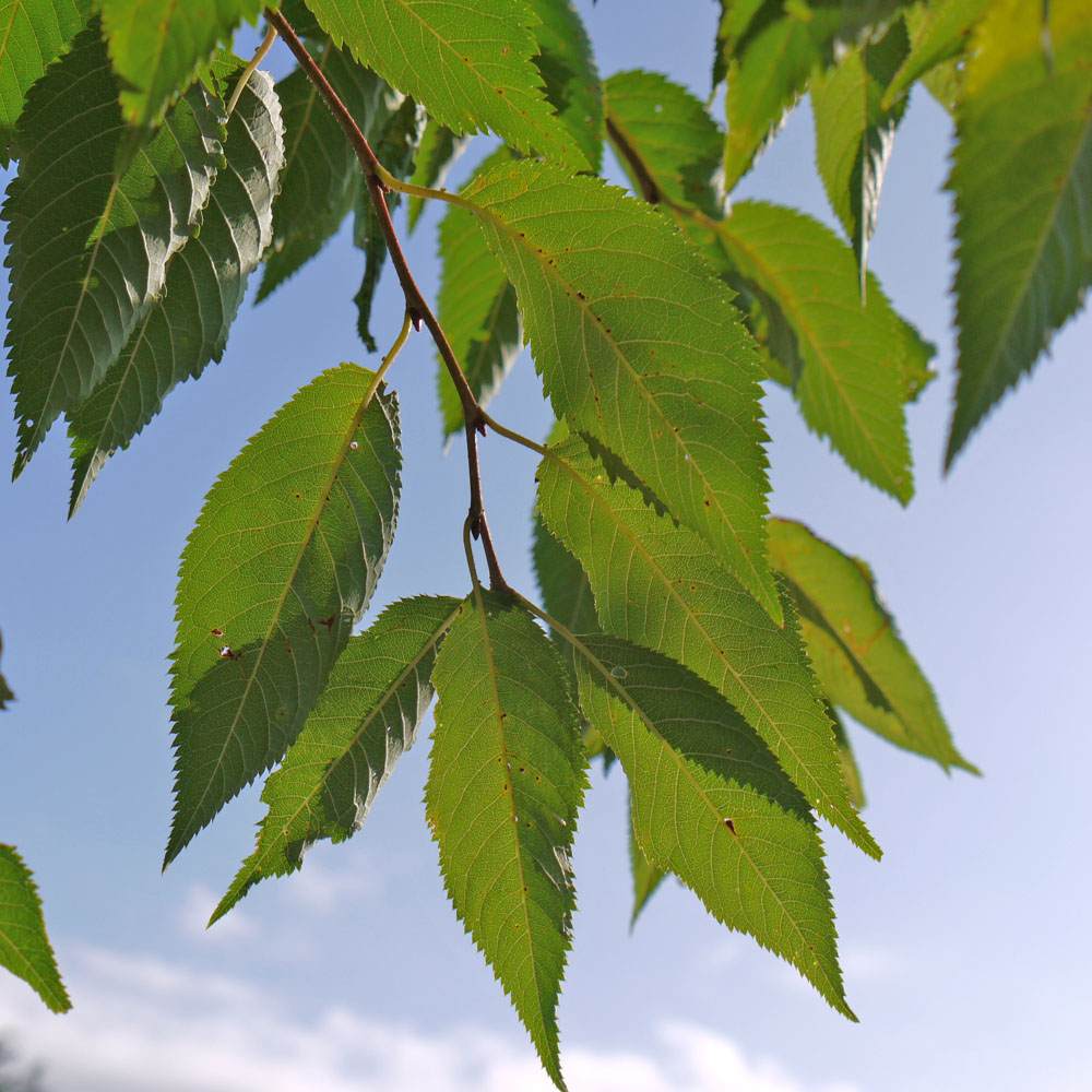 The Winter Flowering Cherry tree has green leaves that turn to seasonal shades of yellow and orange in the autumn.
